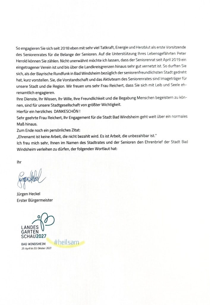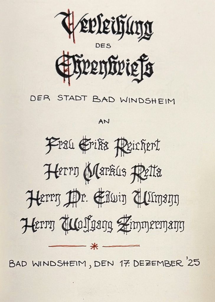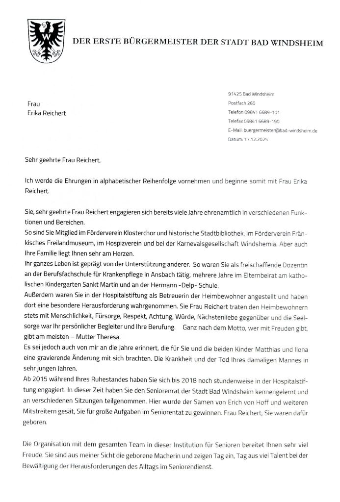 kurz vor Weihnachten konnte ich vier sehr verdiente Mitbürgerinnen und Mitbürger mit dem Ehrenbrief der Stadt Bad Windsheim auszeichnen.