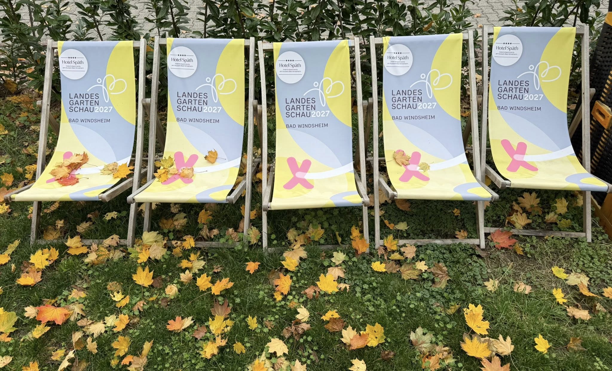 Gestern entdeckte ich ganz zufällig ein besonderes Bild, das den Übergang vom Sommer zum Herbst auf eindrucksvolle Weise zeigt: die sommerlichen Liegestühle der Landesgartenschau in Bad Windsheim. Eingebettet in herbstliches Laub, vermitteln sie eine Atmosphäre von Ruhe und Ausklang – ein Symbol dafür, dass die warme Jahreszeit und die ausgiebige Liegezeit langsam zu Ende gehen.